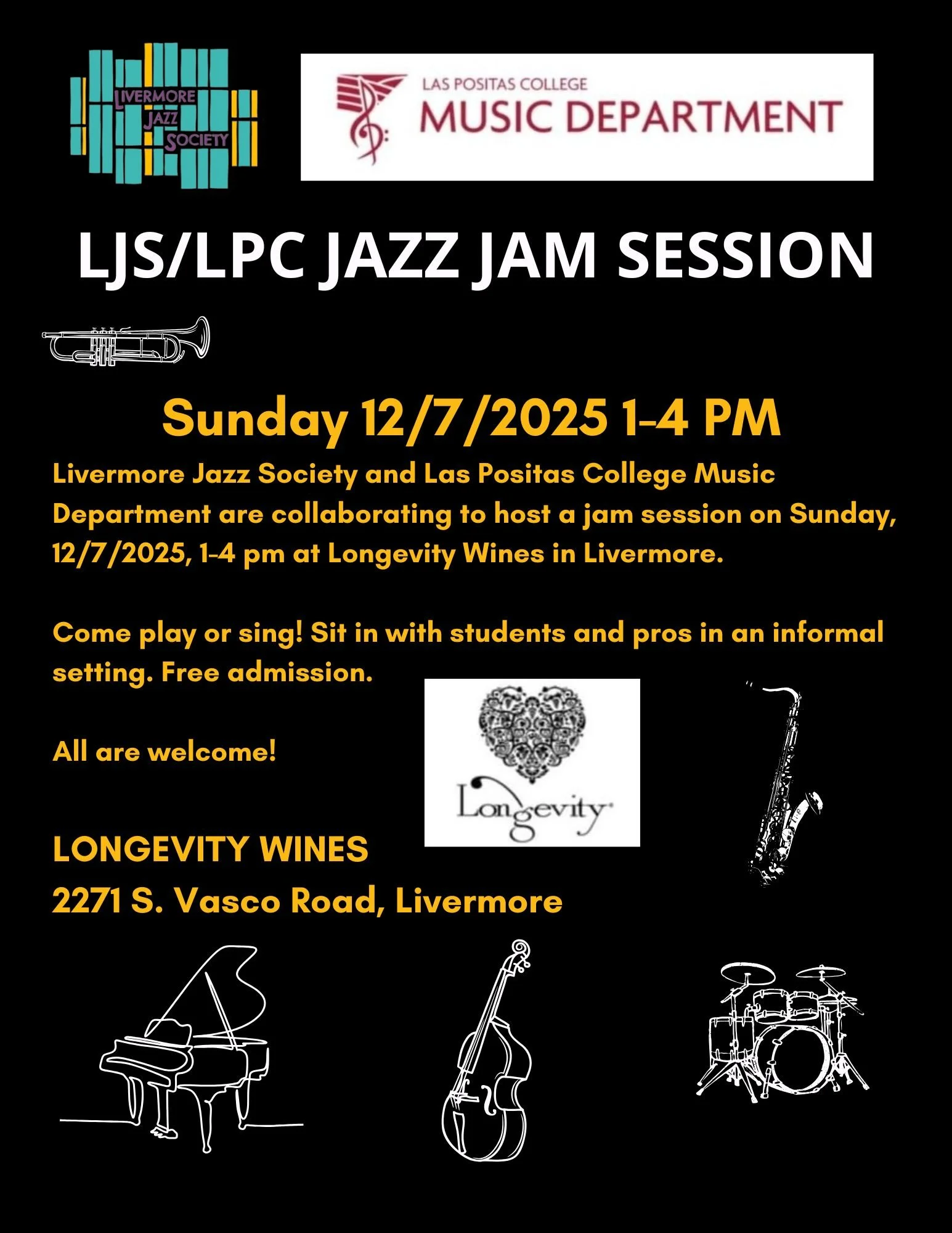 LJS is hosting a collaborative jam session with Las Positas College on Sunday, 12/7/2025 from 1-4 pm at Longevity Wines, 2271 S. Vasco Road, Livermore CA 94550.